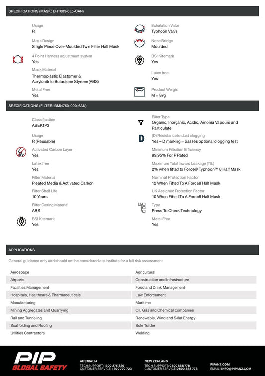 PIP BHT0B3-0L5-NAN Force Typhoon 8 Half Mask Respirator Pack A2P2 Filters