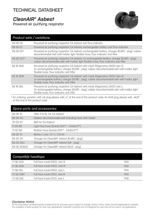 Maxisafe RPA519a CleanAir Asbest PAPR with RCF02 Mask, P3 Filter, Hose & Belt