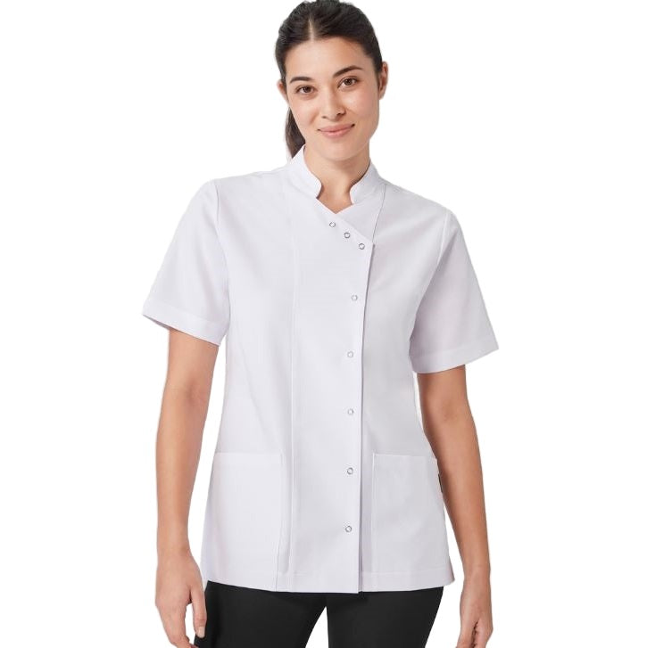 Designed to be comfortable and functional with water repellent treatment. Perfect for Beauty, Dentistry, Pharmacy and Medical industries. Modern styling, with neat standing collar and streamlined short-sleeve silhouette, creating a smart look. The asymmetrical front offers extra coverage and a flattering fit, while the ring-snap fastener closure makes it easy to slip on and go.