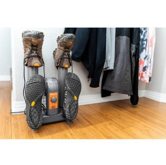 The DryGuy Force DRY DX - Boot and Glove Dryer has the ability to dry two pairs of boots, shoes, or gloves within 1 to 2 hours. Utilizing gentle forced air and 105° F (40.5° C) heat, the device dries a variety of articles from wet shoes to soggy gloves, helping to remove moisture quickly and prevent the growth of fungus and bacteria.