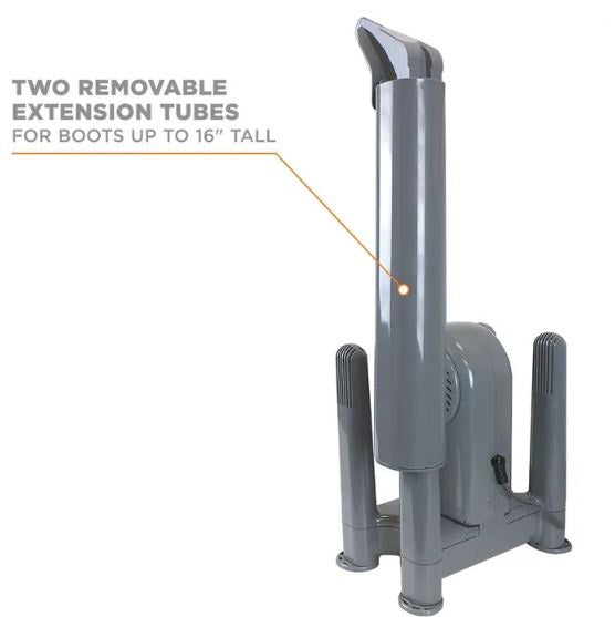 - Includes two removable extension tubes for use with boots up to 16 inches tall; whisper-quiet rotary blower; 3 hour timer; heat or no-heat switch