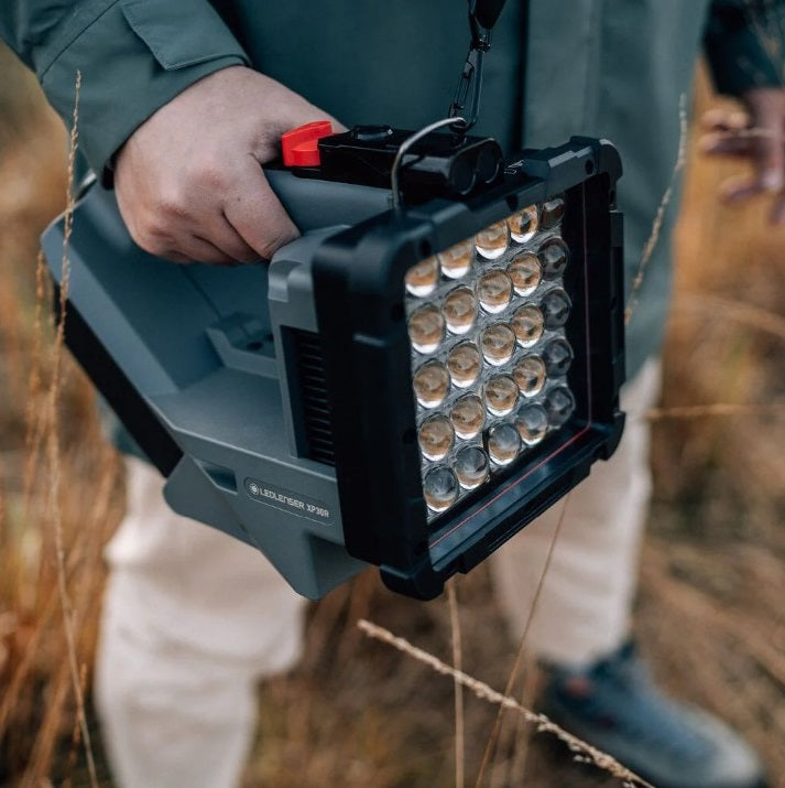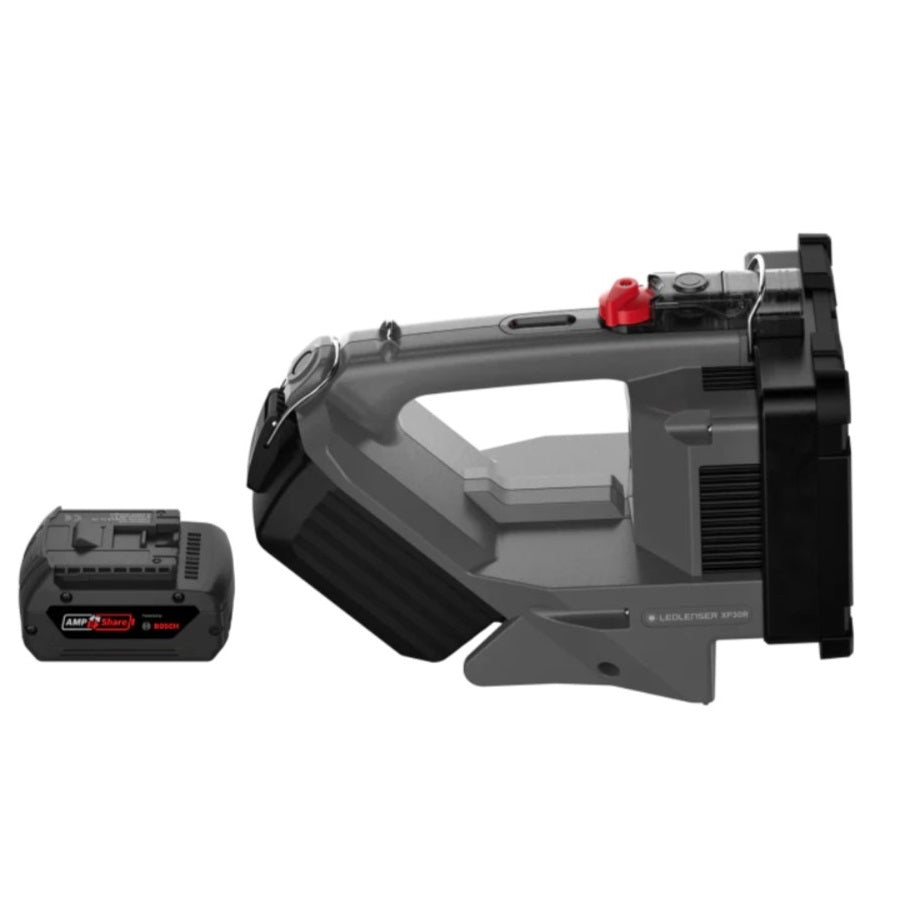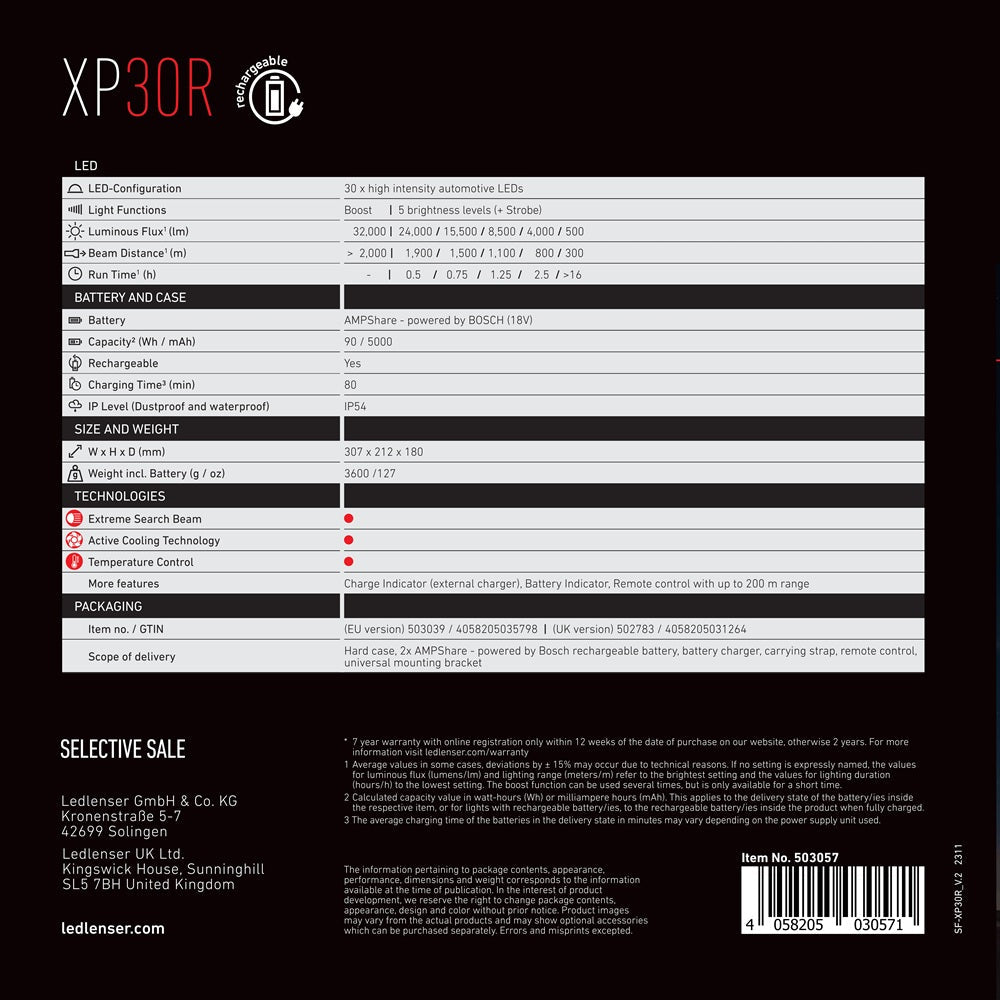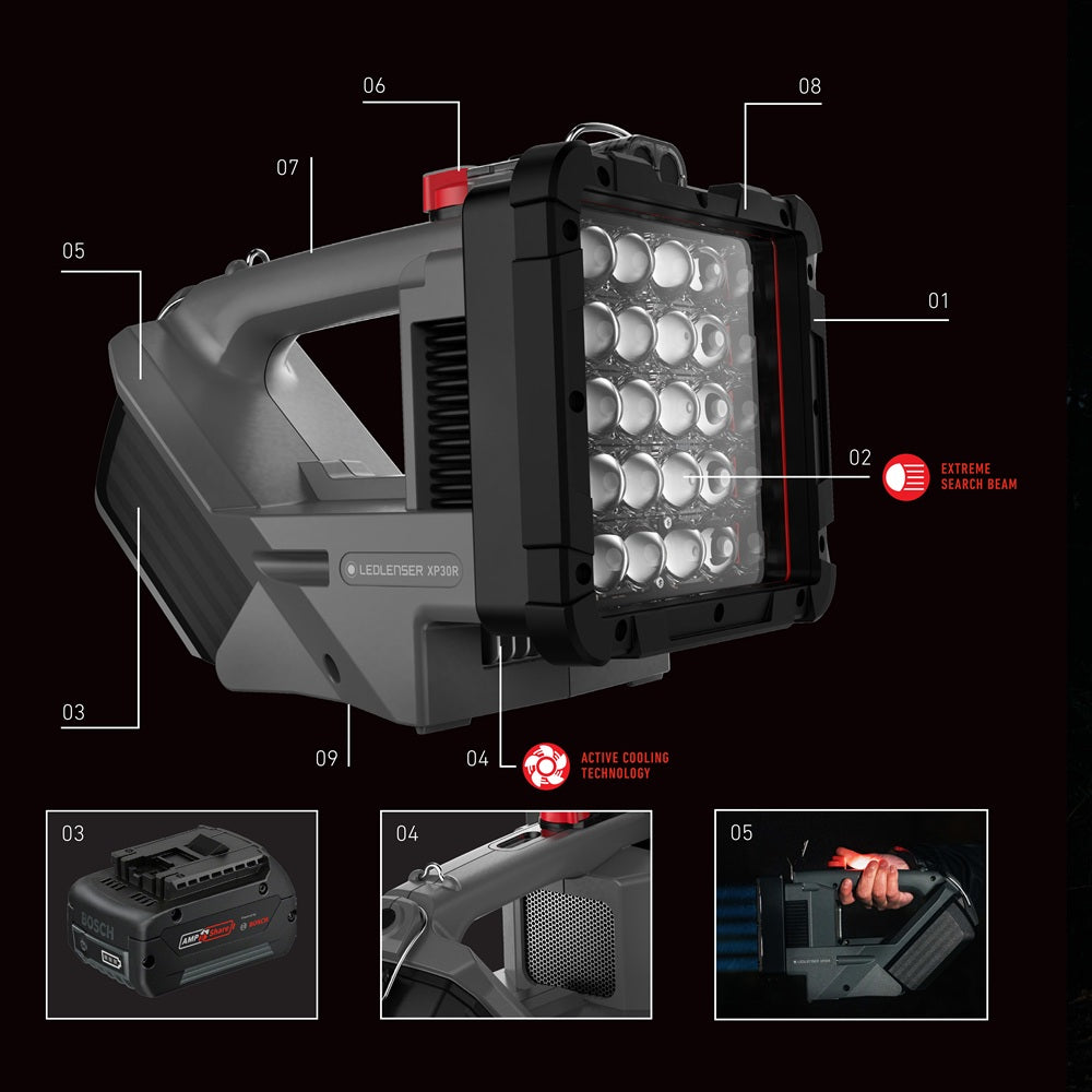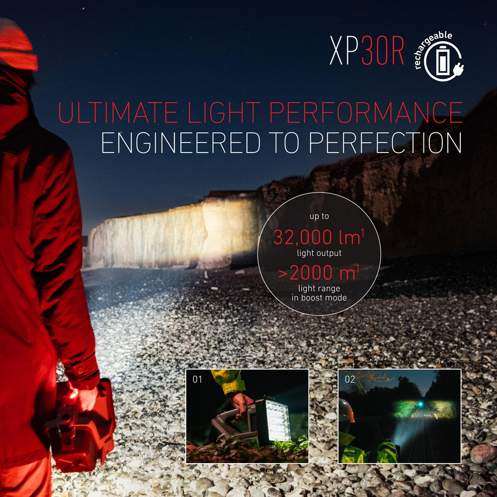 The ultimate high-end spotlight XP30R is the crowning glory of the Ledlenser portfolio and a masterpiece of light engineering: The incredible luminosity and range combined with the compact size of this highly professional, portable light are exceptional. 30 powerful automotive LEDs form the heart of the XP30R, combined with specialized optics for extreme long-range vision. Thanks to active cooling and a powerful AMPShare – powered by Bosch battery, the XP30R achieves a light output of up to 32,000 lumens. It can also be controlled remotely from up to 200 meters. These characteristics make the XP30R the ultimate tool for extreme applications with maximum light requirements.