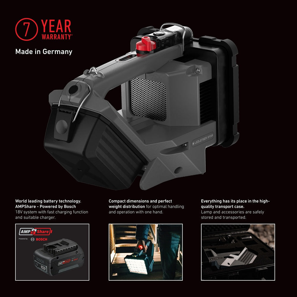 Made in Germany. The ultimate high-end spotlight XP30R is the crowning glory of the Ledlenser portfolio and a masterpiece of light engineering: The incredible luminosity and range combined with the compact size of this highly professional, portable light are exceptional. 30 powerful automotive LEDs form the heart of the XP30R, combined with specialised optics for extreme long-range vision. Thanks to active cooling and a powerful AMPShare – powered by Bosch battery, the XP30R achieves a light output of up to 32,000 lumens. It can also be controlled remotely from up to 200 meters. These characteristics make the XP30R the ultimate tool for extreme applications with maximum light requirements.