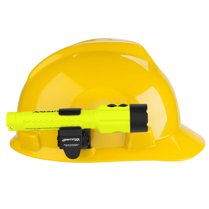 The multi-angle mount design is compatible with most hard hats, featuring both an adjustable accessory slot mount and a brim mount, allowing articulation both above and below the brim. Compliant with NFPA-1971-8.6 (2013) requirements.