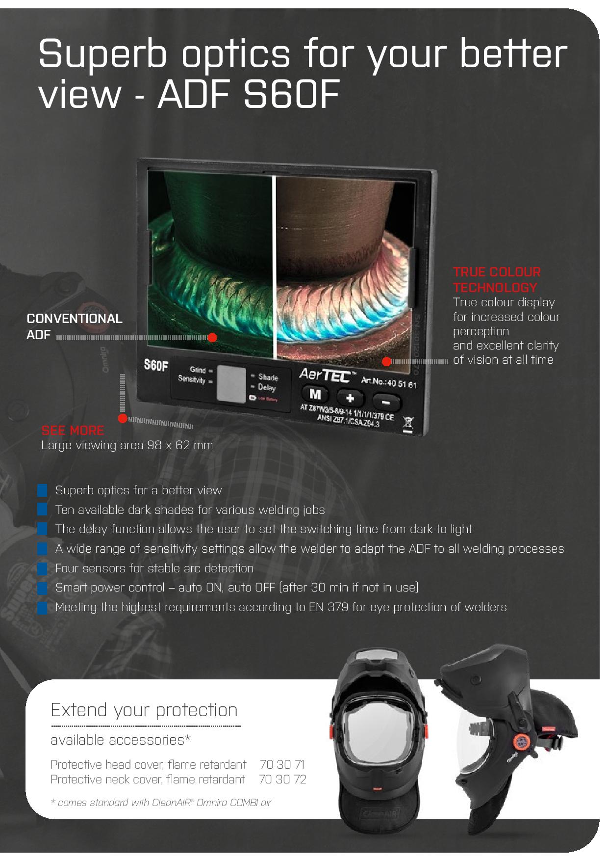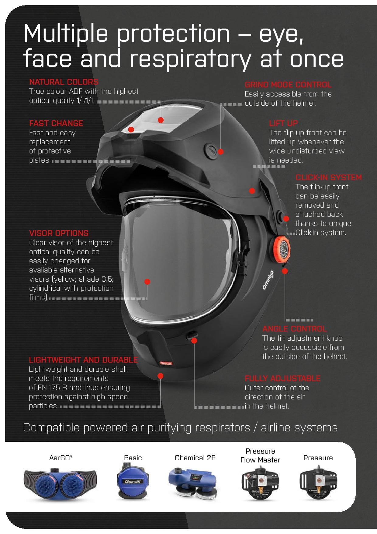 The set includes a autodarkening welding helmet Omnira COMBI air with an advanced built-in air distribution system and flip-up welding shield, time-proven powered air purifying respirator CleanAIR AerGO and all necessary accessories.