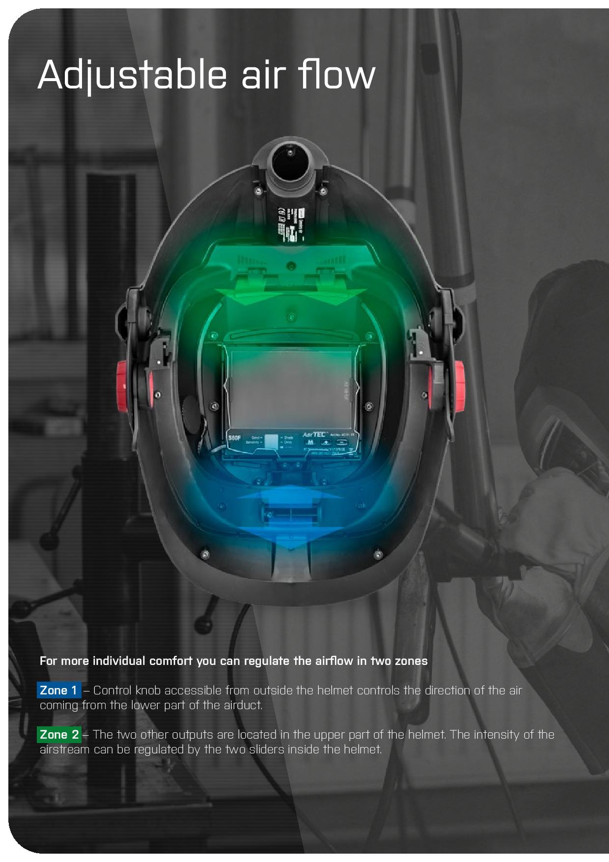 - Outer control of the direction and intensity of the air in the helmet.
