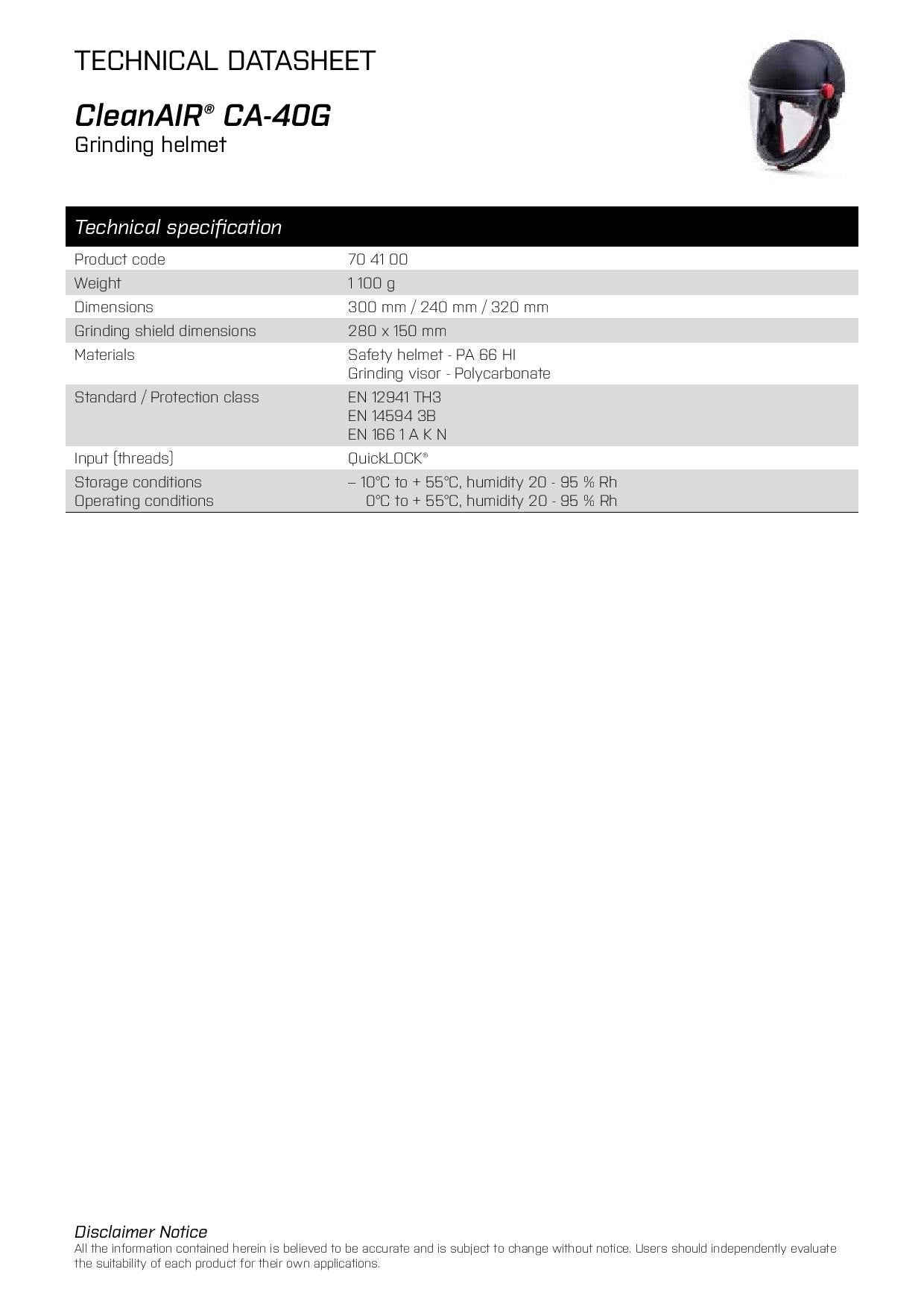 Combination of a grinding visor and a safety helmet with integrated air distribution. Ensures protection of the head, eyes, face, respiratory and hearing. The helmet offers well-balanced, comfortable and robust protection certified in accordance with EN 397 while the polycarbonate shield provides protection against high speed, high energy particles and is certified in accordance with EN 166 - Class A.