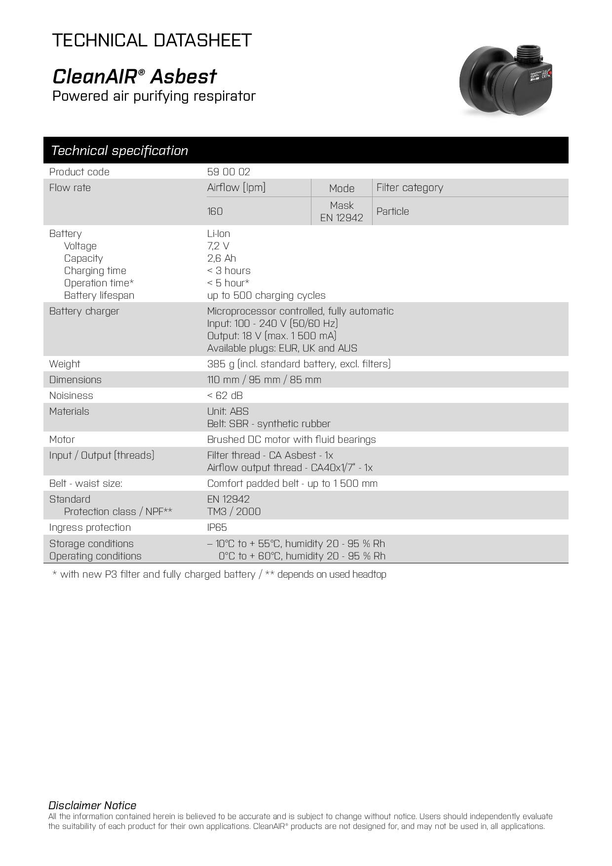 The powered air respirator CleanAIR® Asbest and the high quality, full face masks GX02/CF02 offer an exceptionally light and compact combination with excellent durability and the highest level of respiratory protection. The complete combination of CleanAIR® Asbest with a full face mask Shigematsu and a highly effective filter against particles guarantees high nominal protection factor (NPF 2000), sufficient airflow and simple decontamination. The system is designed for active respiratory and face protection during remediation of asbestos-containing materials and can be mounted directly on the mask or connected to the mask with a hose and worn on a belt. Special emphasis has been placed on the low weight and simple operation.