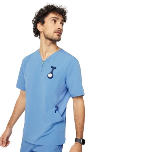 The Charles Scrub Top combines a slim fit with sleek, functional design. Featuring a V-neck opening and a center front zip, it offers ease of wear and a customizable fit. With short sleeves and a mid-length cut, this top provides both comfort and style. Two hip pockets offer practical storage, while contrast key loops at the shoulder and one pocket add a stylish touch. Side splits enhance movement, and the high-stretch rib fabric side panels ensure extra stretch and comfort for all-day wear.