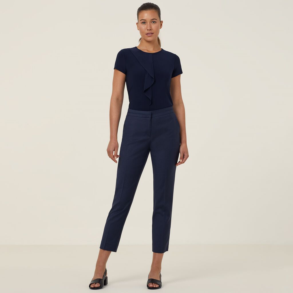 The smart crew neckline is neatly bound for a refined finish, while the cascading asymmetrical drape detail adds interest to the otherwise simple styling. Tuck it into a streamlined skirt for a polished look or wear it loose with relaxed pants for a more laidback approach to work wear.