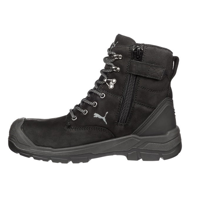 The Puma Safety 630737 Conquest Black is a 7” boot that has a full waterproof membrane, YKK spiral zip side and webbing to protect the wearer’s feet from getting wet. The upper is made of premium nubuck leather and has a drawn-up scuff cap in the toe area to reduce leather abrasion when working on knees.
