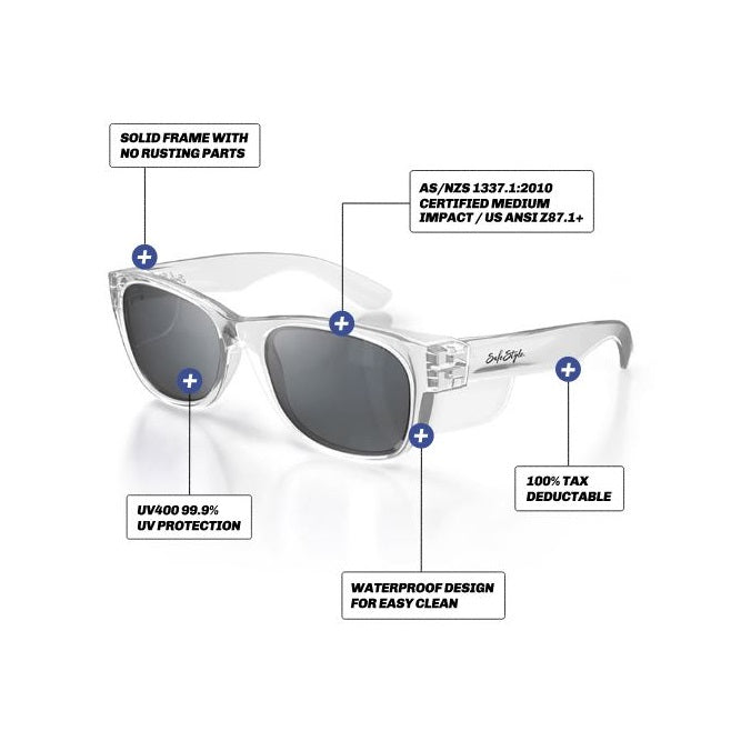 The SafeStyle Classics are the original safety glasses design that started it all. An iconic & stylish look paired with AS/NZS 1337.1 certified protection allows this pair to blend easily ‘from the worksite to the weekendSafeStyle’s tinted lenses are perfect for outdoor use with a dark tint for general use while being productive on the job. Although these are non-polarised they still protect your eyes from the suns harmful rays.